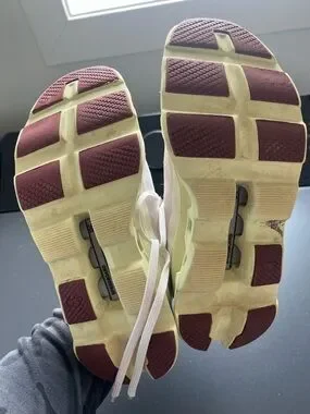 On Running Cloudnova sneakers. Light pink upper with pale yellow midsole and accents. Breathable mesh upper. Cushioned CloudTec midsole for comfort. Stylish laces with subtle maroon eyelet details. In good condition.