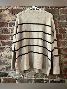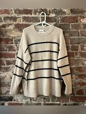 Beige crewneck sweater with bold black horizontal stripes. Soft knit fabric and relaxed silhouette. Ribbed cuffs and hem for added structure. Versatile neutral piece for casual outfits.