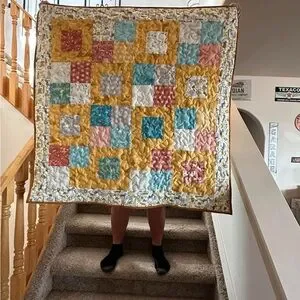 Vibrant patchwork quilt with a mix of colors in the Noah’s Ark theme. Features yellow, blue, pink, and cream squares. Perfect for adding a pop of color to any room. Backing is camo flannel.