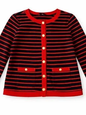 Talbots PATCH POCKET CARDIGAN - DELFINA STRIPE in navy and red. Crew neckline and soft ribbed texture. Classic horizontal stripe pattern. Versatile piece for layering. 100% cotton. Perfect alternative to a blazer. Lady jacket style.