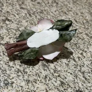 Handcrafted porcelain rose. Soft pink outer petals with creamy yellow centers. Detailed green leaves and realistic stem accent. Delicate floral home decor.