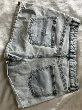 High-rise mom shorts in a light wash. Distressed details on front panels. Rolled hem for a casual look. Classic five-pocket denim styling. Easy to pair with tees or tanks.