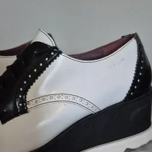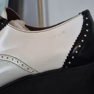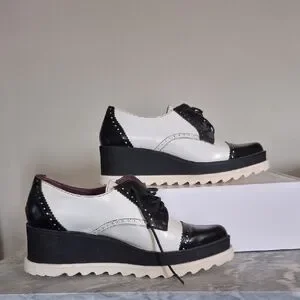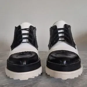Platform oxford shoes, aka platform brogues. Mens wear inspired, these shoes feature a black and white two-tone design, a lace-up closure, and a thick platform lug sole. This style is a blend of a classic oxford shoe with a modern, chunky platform.