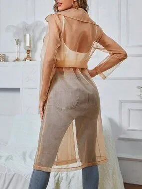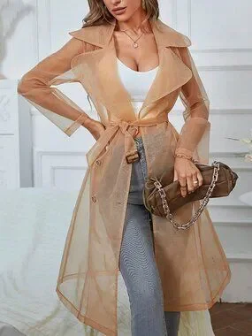 A sheer mesh windbreaker in apricot offers a long, thigh‑length silhouette with a slim fit and regular hem. The double‑breasted placket and tie‑front detail add a sleek, adjustable look, while a detachable belt cinches the waist. A classic collar, regular sleeves, and convenient side pockets complete the design, making it ideal for breezy days when a lightweight, transparent layer is desired.