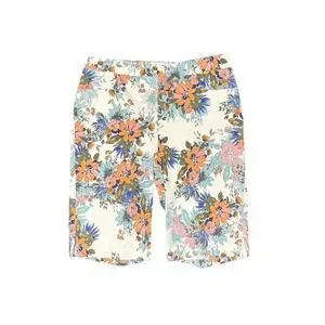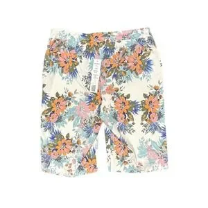 These stylish shorts feature a comfortable blend of rayon, nylon, and spandex, providing a slight stretch for a perfect fit. Designed with a classic Bermuda length, they offer a flattering silhouette suitable for casual outings or summer gatherings. The intricate floral pattern includes shades of blue, orange, and pink on a white background, making them a versatile addition to any warm-weather wardrobe. MSRP $75 CDN.