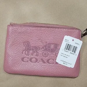 Coach Meadow Rose Pebbled Leather Corner Zip Wristlet NEW with Tag. Featuring the Horse and Carriage motif. Crafted from refined pebble leather with a fabric-lined interior. Zip-Top closure, two internal credit card slots, and an attached wrist strap. Measurements in photos.