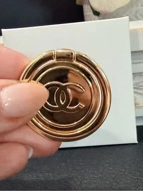 The CHANEL Beaute Finger Phone Ring Stand Holder is a luxurious accessory that doubles as a convenient phone mount. Made by the prestigious brand Chanel Beaute, this ring stand holder is designed in a stylish gold color.
