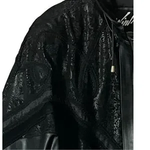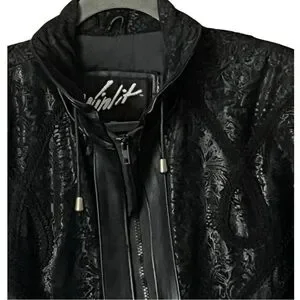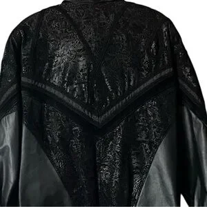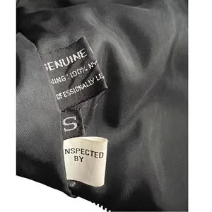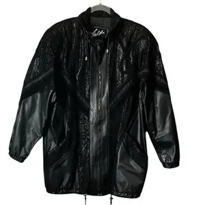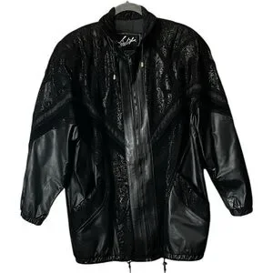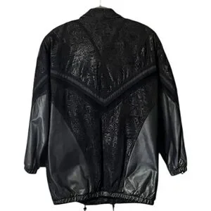 Vintage Winlit Black Leather Detail design women’s Jacket. SZ. S. Zipper front. Drawstring waist. Two,pockets. Lined. Shoulder pads. Elastic cuffs. Drawstring neck area. Pit to,pit approx. 24”. flat lay. Length 33”. Great condition.