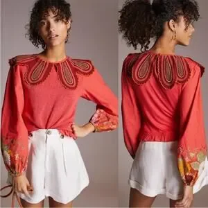 An intricately embroidered collar infuses this blouse with feminine sophistication.