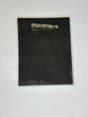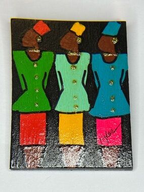 This colorful folk art painting ( 2.5 x 1.5”) on a pin features three women in vibrant outfits and hats, and it is signed Tyler in the bottom right corner.