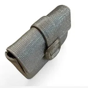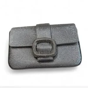 Zara clutch with full crystal embellishment. Front buckle detail with matching crystals. Sleek flap closure. Structured rectangular silhouette. Elegant metallic shine for special occasions.