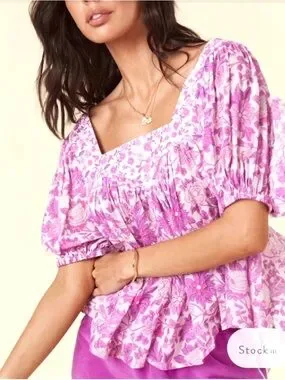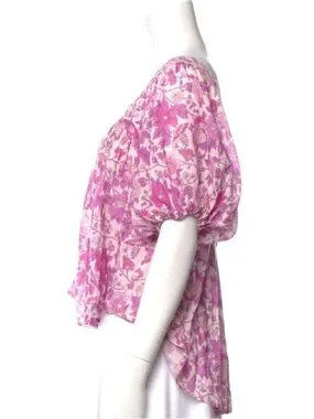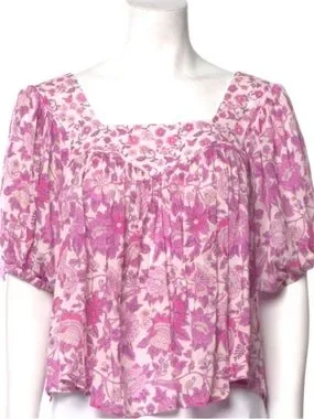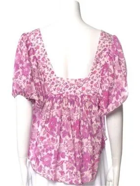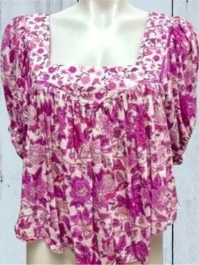 relaxed drapey fit, femme floral pink print, square neckline, pleating at shoulders, elastic sleeve cuffs, hi-low hem