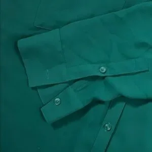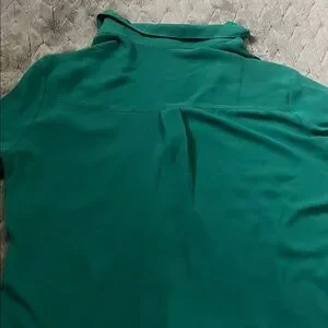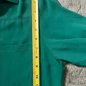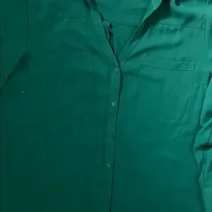 Vibrant emerald green button-down blouse by Express. Classic collared neckline with front buttons. Single chest pocket and long sleeves with button cuffs. Smooth, drapey fabric for easy styling.