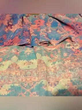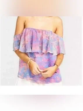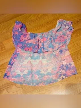 Pretty off-shoulder top with a soft ruffle neckline. Floral pastel purple and pink print adds a feminine touch. Lightweight, breezy fabric perfect for warm days. Easy to style for casual or dressy looks.