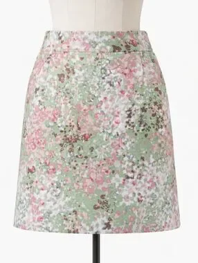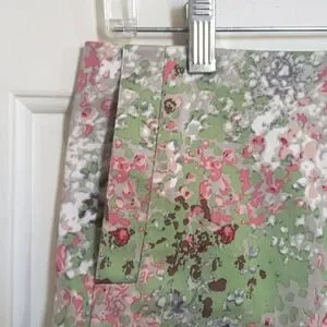 A dreamy abstract floral mini skirt from J.CREW, featuring a soft watercolor print in muted pistachio green, blush pink, bluish gray, brown, and white. Crafted from a breathable cotton-spandex stretch blend for comfort and shape. Designed with a flattering tailored waistband, concealed back zipper with hook and eye closure, and functional side pockets. Excellent condition.