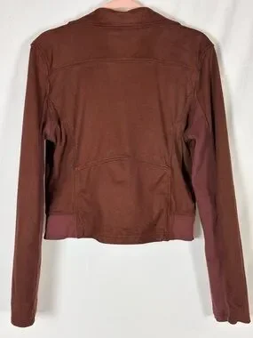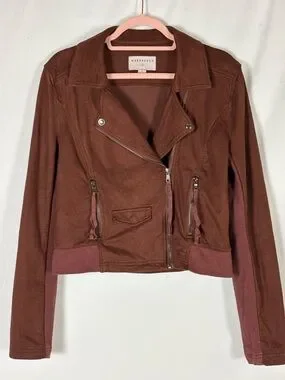 Stylish brown moto jacket with a tailored silhouette. Features zip-front closure and angled pockets for modern edge. Lightweight and versatile for everyday wear. Pair with jeans or skirts for a polished look. Anthropology brand.