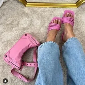Heeled sandals with thin straps at instep. Squared toe