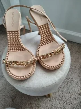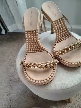 Chic and modern heels inspired by the iconic Bottega Veneta design. These nude sandals feature a bold gold chain strap and a unique textured sole that gives them a luxurious, fashion‑forward look. Stylish, versatile, and perfect for elevating any outfit.