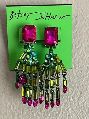 Betsey Johnson drop earrings with bold hot pink studs. Lime green and pink crystal fringe creates dramatic movement. Shiny faceted stones catch the light. Playful, statement-ready for nights out.