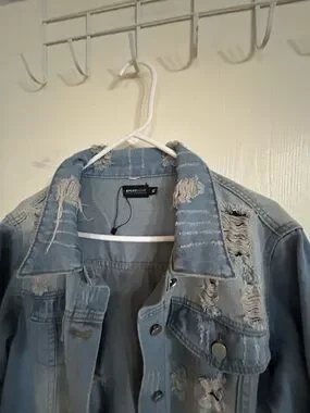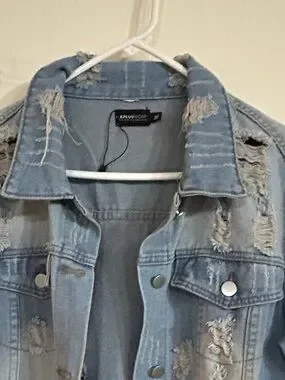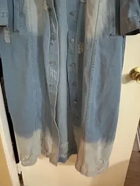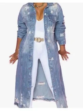 A long, distressed denim jacket dress in light blue for a bold layered look. Features button-front styling and intentional rips for an on-trend finish. Pairs easily with casual or dressed-up outfits for versatile wear.