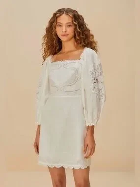 The FARM RIO ACTIVE mini dress is crafted from responsible Euroflax™ premium linen. It features a square neckline, puff sleeves, scalloped hem and delicate lace embroidery. It has an invisible zipper at the side seam.