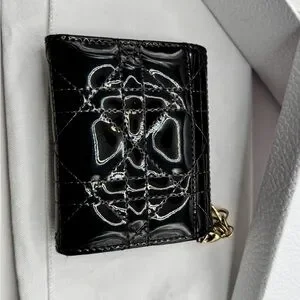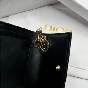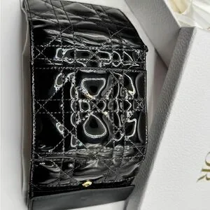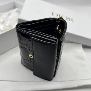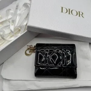 Christian Dior Lady Dior Patent Cannage Compact Wallet in classic black with gold-tone “D.I.O.R.” charm. Crafted from glossy patent leather with iconic cannage quilting, this piece embodies timeless elegance in a compact silhouette.