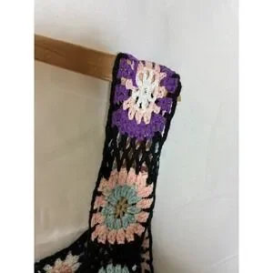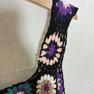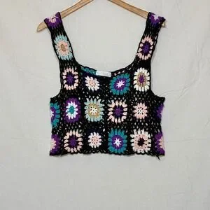 Crochet tank top features a multi-color granny square pattern on a black open-knit base. The sleeveless design includes a square neckline and wide straps, sheer/see through, perfect for layering.