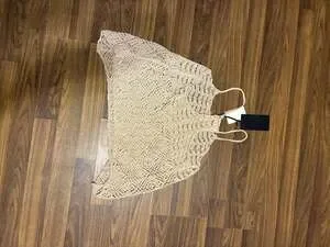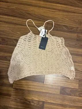 AMOLI sheer knit cami in beige. The fabric has a nice textured weave and drapes well. Works as a layering piece or on its own depending on what you're wearing underneath.