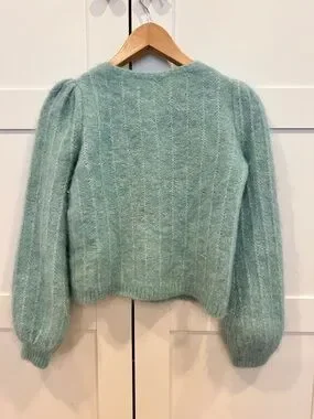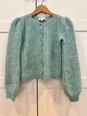 Like new condition. Sea green with matching buttons and scallop edge detail.