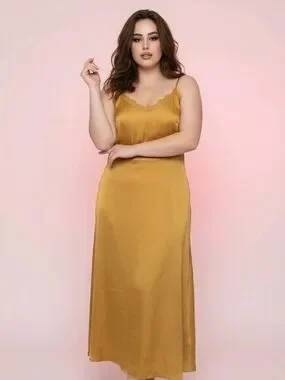 Elegant Wilfred (Aritzia) satin slip midi dress in a rich gold / mustard tone.