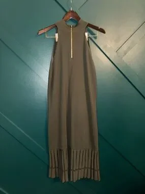 Sleeveless knit dress with a mock neckline. A-line skirt with subtle pleat detail. Gold zipper hardware at back. Soft textured fabric with drape. Classic olive green tone.