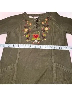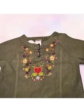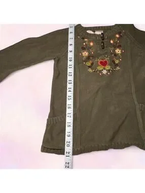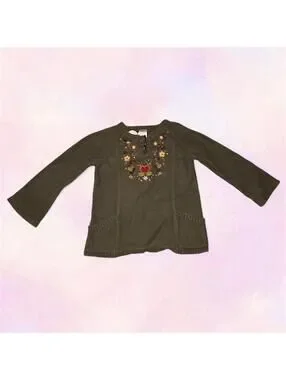 navy green childrens top from gymboree, early 2000s (2006), featuring floral embroidery, wooden buttons, and 2 front pockets