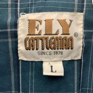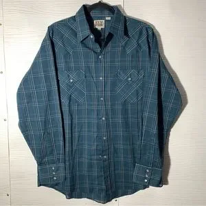 Iconic Ely Cattleman western shirt in rich teal plaid with authentic pearl snaps, dual chest flap pockets, and classic front and back yokes for that timeless cowboy vibe. Heritage brand since 1878 delivers durable, sharp style perfect for rodeos, casual outings, or everyday rugged wear. Excellent pre-owned condition – clean, vibrant, and ready to ride. Grab this classic pearl snap for effortless western cool and lasting quality.