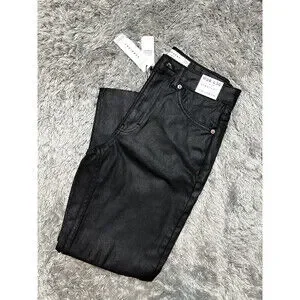A sleek coating finishes these high-waist jeans that elevate your day-to-night vibe. If purchasing for the first time, use size guide. Topshop US sizes shown. 24=0, 25=2, 26=4, 27=5, 28=6, 29=7, 30=8, 31=9, 32=10, 33=11, 34=12, 35=13, 36=14. High rise. 24" inseam; 14" leg opening; 10" front rise; 14" back rise (size 24). Zip fly with button closure. Five-pocket style. 99% cotton, 1% elastane. Machine wash, line dry. Made in Turkey. Women's Clothing