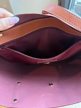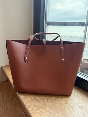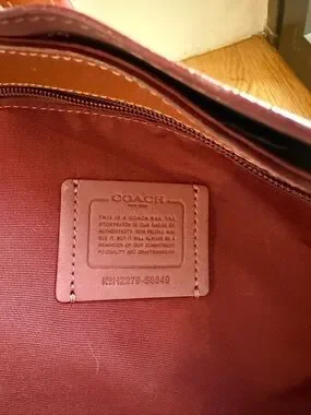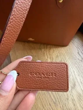 Clean, structured silhouette with dual top handles. Center strap with snap closure for quick access. Subtle COACH logo at the base and a leather hang tag.