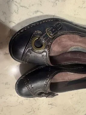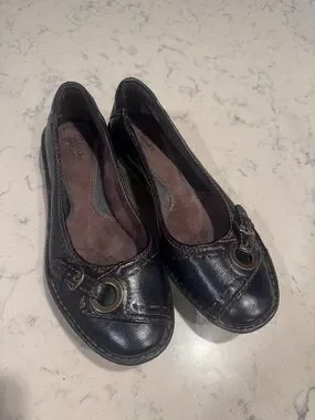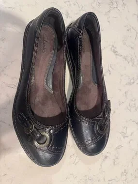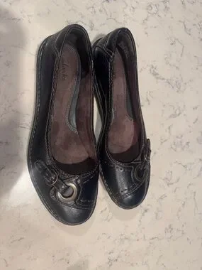 Clarks Women's Y2K Black Leather Ballet Flats with Brass Ring Buckle Accent