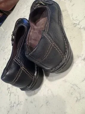 Comfortable leather flats by Clarks. Soft padded footbed for daily wear. Brass ring and buckle accents for subtle detail. Bold contrast stitching adds a handmade, whismy texture. Neutral black pairs easily with outfits.