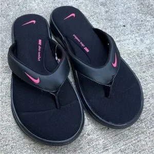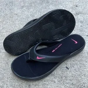 Nike flip-flop thong sandals in black with bright pink logo accents. Soft cushioned footbed for everyday comfort. Sporty, minimalist design for casual wear.