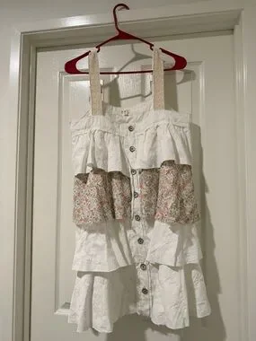 Sleeveless tiered mini dress by POL. Button-front design with ruffled layers. White fabric with pastel floral panels. Cute and breezy silhouette. Easy summer look.