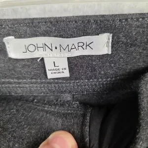 Branding and labels: Interior John Mark brand label with secondary size tag marked L and Made in China.