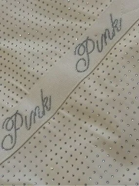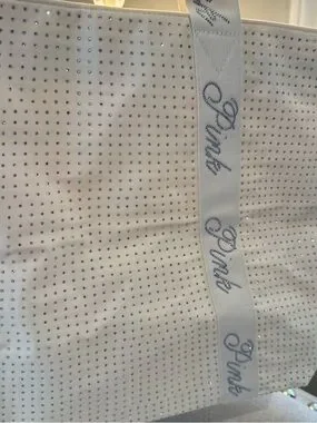 Ivory PINK tote with sparkling crystal-studded body. Wide branded straps feature glittery PINK logo. Lightweight and roomy for daily use. Simple, chic design with subtle shine.