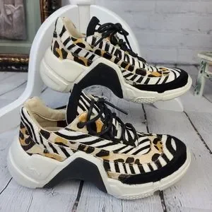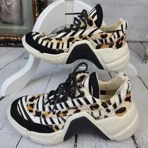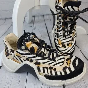 Mark Nason sneakers featuring leopard and zebra prints. Crafted from calf hair and leather upper, these sneakers boast a neo block midsole and a synthetic sole. Available in size 6, they are brand new with box, although the lid is missing. Rest assured, the shoes will be securely shipped in a second box.
