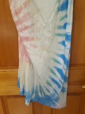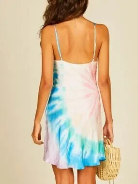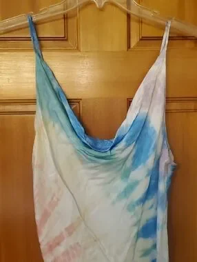 Soft silky tie-dye slip dress with a relaxed cowl neckline by Surf Gypsy. Thin adjustable-style straps. Flowy, lightweight fabric with gentle drape. Pastel blue and pink accents on a creamy base. Use as a dress or coverup. Approx 37in length from bodice where strap connects, 16.5in bust