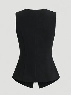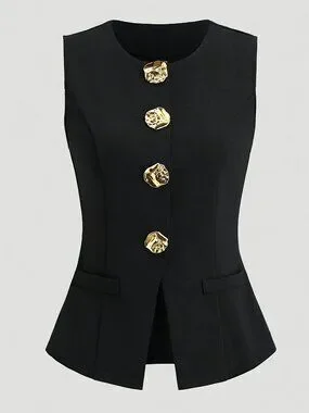 Black French Style Sleeveless Blazer Vest – Gold Button Elegant Top