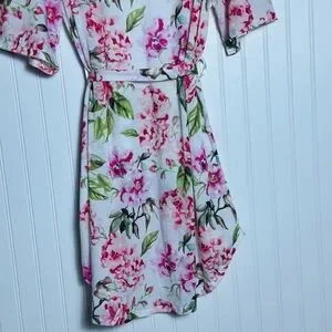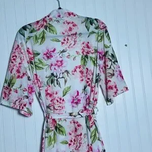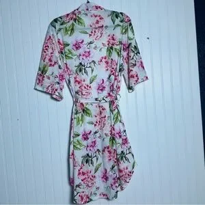 Chic robe with vibrant floral design. Features pink and green hues.