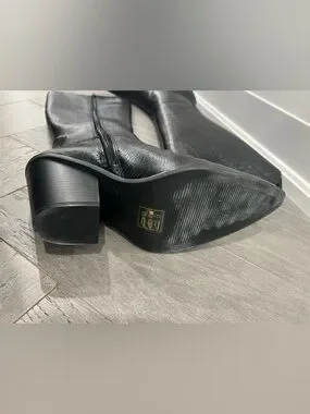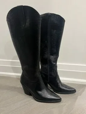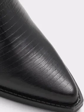 Sleek black high boots with a textured embossed finish, pointed toe, and sturdy block heel. A refined, leg-lengthening silhouette that’s equal parts edgy and elegant perfect for dressing up or elevating everyday looks.