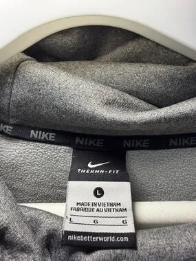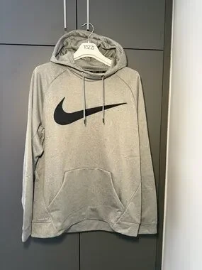 Nike pullover hoodie in light grey with a bold black Swoosh on chest. Hood with drawstrings and front kangaroo pocket. Soft athletic fabric for casual wear.