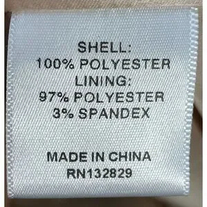 ~ Shell: 100% polyester; Lining: 97% polyester 3% spandex