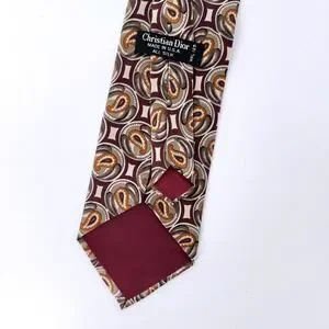 Christian Dior silk tie showcases a sophisticated geometric paisley medallion pattern in a rich palette of burgundy, gold, and grey. Crafted in the USA from premium all-silk fabric, this accessory features a classic wide blade and a smooth, luxurious hand feel. The intricate circular motifs and warm earth tones make it an ideal choice for elevating professional attire or formal ensembles.