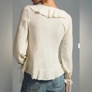 Anthropologie Cream Ruffled V-Neck Long Sleeve Blouse